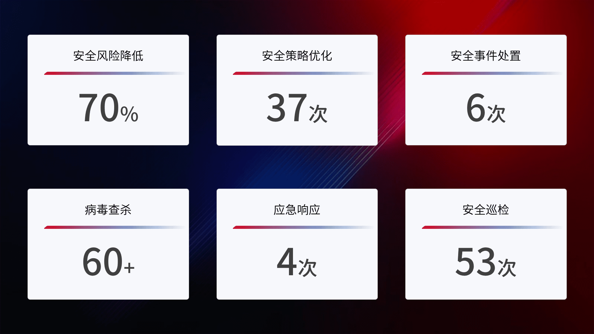 提供全面的安全事件报告体系,,包括处置报告、、、、周报、、、、季度和年度总结,,结合持续监控,,帮助客户深入了解网络安全状况。。