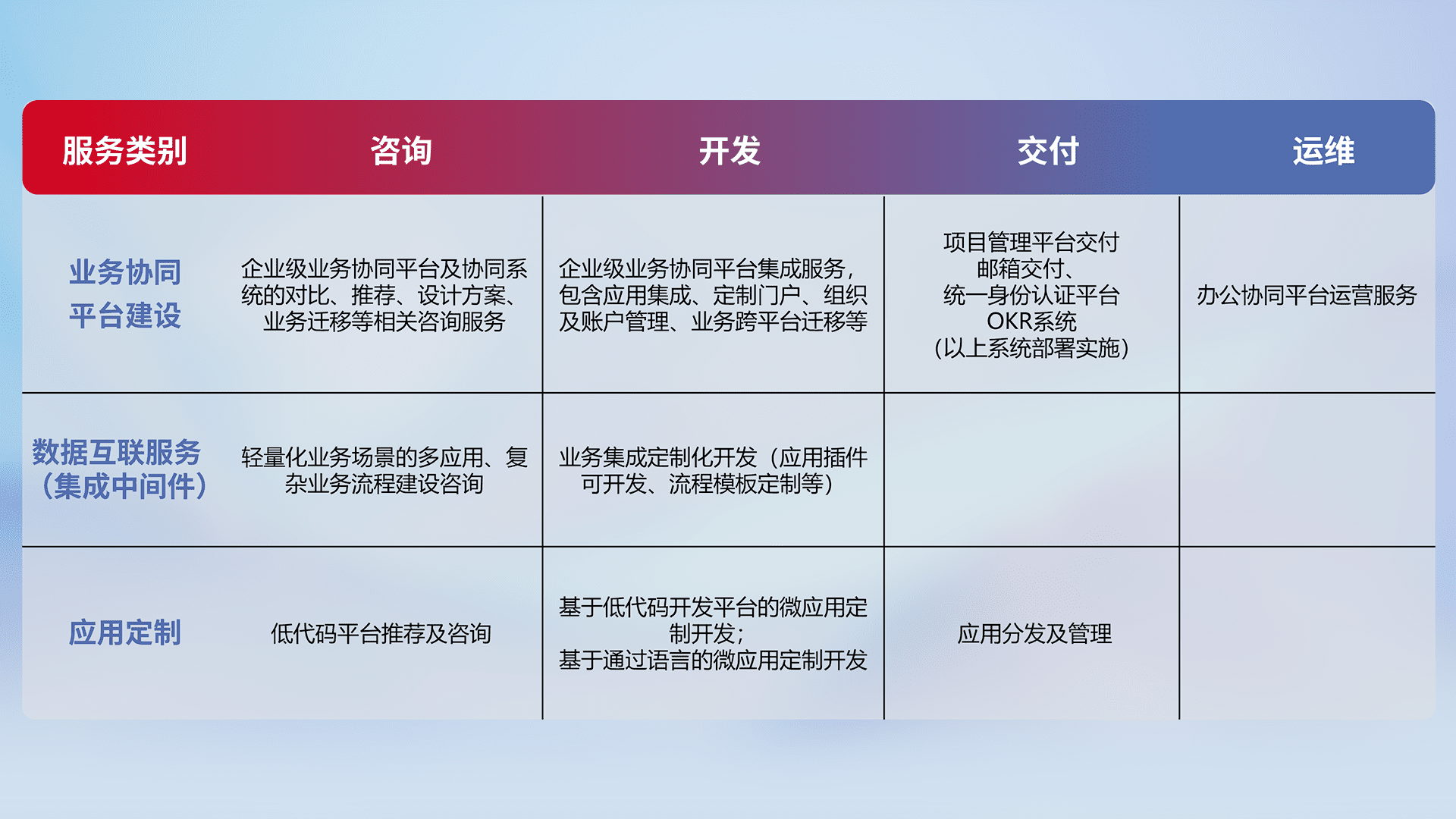 针对钉钉、、、、企微、、、IDaas等平台级产品提供产品的规划、、、、方案、、、交付、、、、定制化开发等服务,,,,实现如统一协同办公、、、智能客户服务、、混合会议管理、、智能数据查询、、、、等业务场景,,实现数字化转型。。